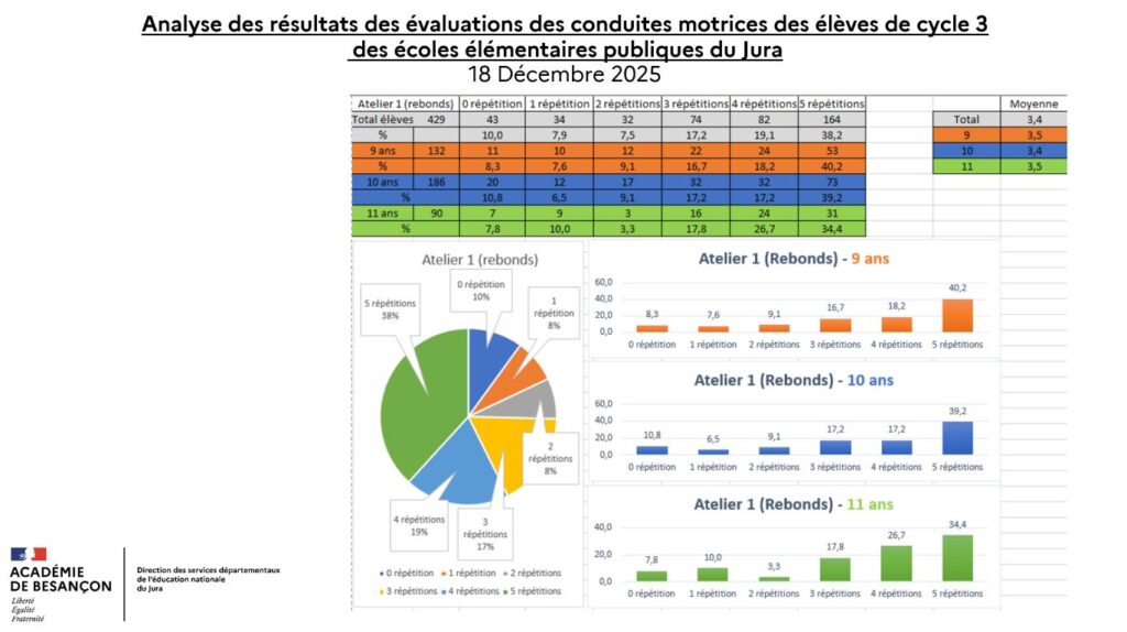 Les données indiquent une moyenne de 3,4 passages réussis et on analyse que ce palier demeure dans une même proportion sur les 3 niveaux d’âge. Le pourcentage d’élèves atteignant les 5 passages réussis diminue d’année en année passant de 40,2 % pour les 9 ans à 34,4% pour les 11 ans, ce qui questionne. De plus, on note une part non négligeable d’élèves ne parvenant pas ou très peu (0 ou 1 répétition) à réaliser l’atelier : environ 18% soit 77 élèves évalués. Ces résultats nous indiquent que l’accent doit être mis dans les apprentissages visant l’amélioration de la lecture de trajectoire et l’anticipation coïncidence. C’est notamment dans les jeux de ballons, de raquettes et de jonglage que les élèves pourront progresser.