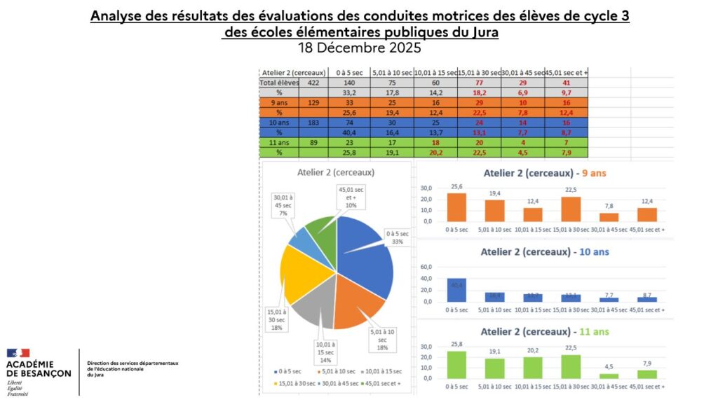Les données indiquent une part importante de réussite rapide dans l’atelier : moins de 10 secondes pour réaliser le parcours pour 51% des élèves. Cependant 55% des élèves de 11 ans montrent des difficultés pour boucler le parcours en moins de 10 secondes, ce qui témoigne de difficultés importantes de coordination pour cet âge. C’est notamment dans les activités d’équilibre et d’appui telles que le SRAV ou les activités athlétiques (multi-bonds par exemple) que ces apprentissages seront les plus progressifs. Des chiffres identiques chez les élèves de 9 ans peuvent d’avantage s’expliquer par l’âge moins avancé.