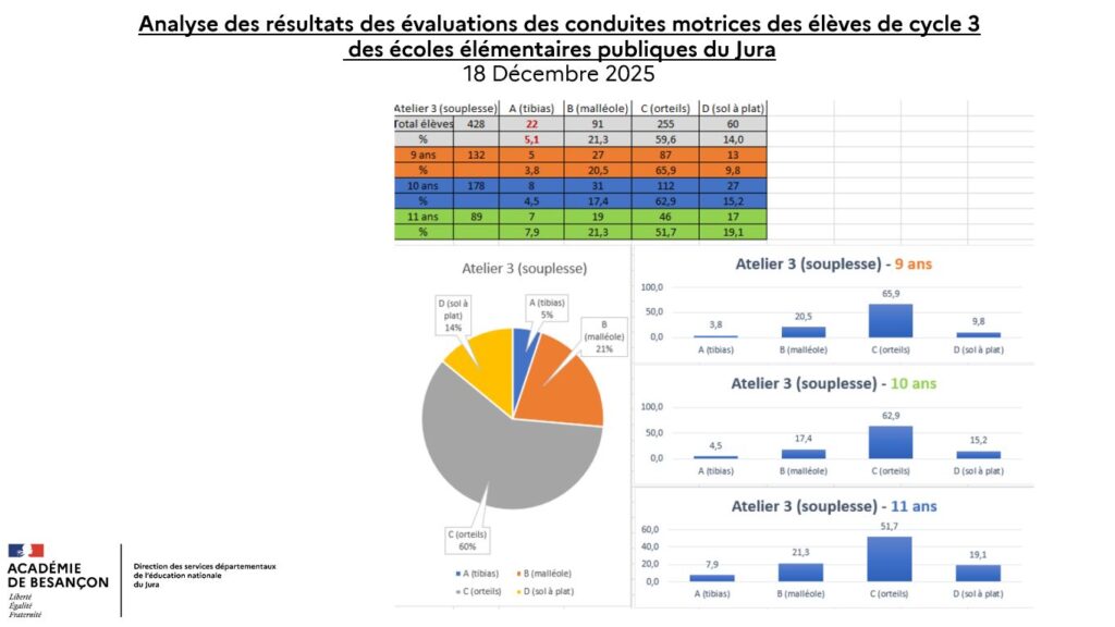 Les données indiquent un état postural satisfaisant pour 95% des élèves. En revanche, l’accroissement constant des élèves obtenant la lettre A (touche tibias) inquiète et peut être le reflet d’une sédentarité installée. Instaurer un rituel en classe sous forme de micro pause active ou en début/fin de séance pour sensibiliser les élèves sur un travail de posture et d’assouplissement dynamique permettra de réduire le nombre d’élèves en difficulté sur ce sujet.