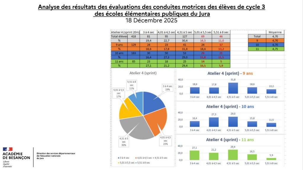 Les résultats montrent une part importante d’élèves en dessous des 5 secondes (72%), ce qui au regard de l’épreuve (20m) et des barèmes des évaluations sur 40m en 6e est plutôt positif. En effet, une évaluation sur 20m témoigne davantage de la réactivité et de l’explosivité au démarrage, qu’à la vitesse de course en amplitude. Certains documents d’accompagnement didactiques établissent un barème d’environ 8 secondes sur 40m pour des élèves de CM1 – conf. document EPS 1D de la circonscription de Beaune (21). Il est intéressant de noter que la part des élèves dans la dernière tranche de chrono (5,51 à 8 secondes) diminue chaque année de scolarité : les principes de posture et d’état d’alerte sont sans doute mieux assimilés et l’activité de course rapide est souvent programmée dans les écoles. En revanche, les résultats des quelques 27,5% d’élèves au-dessus de 5 secondes de sprint peuvent être interprétés par rapport à des facteurs de concentration ou de compréhension des attentes, ce qui reste pédagogique, mais également par des éléments de surpoids ou de manque de vélocité liés à la sédentarité. Il est important, au regard de ces résultats de s’intéresser aux activités de résistance ou de force musculaires comme la gymnastique, la danse dans le volet acrobatique ou encore l’escalade.