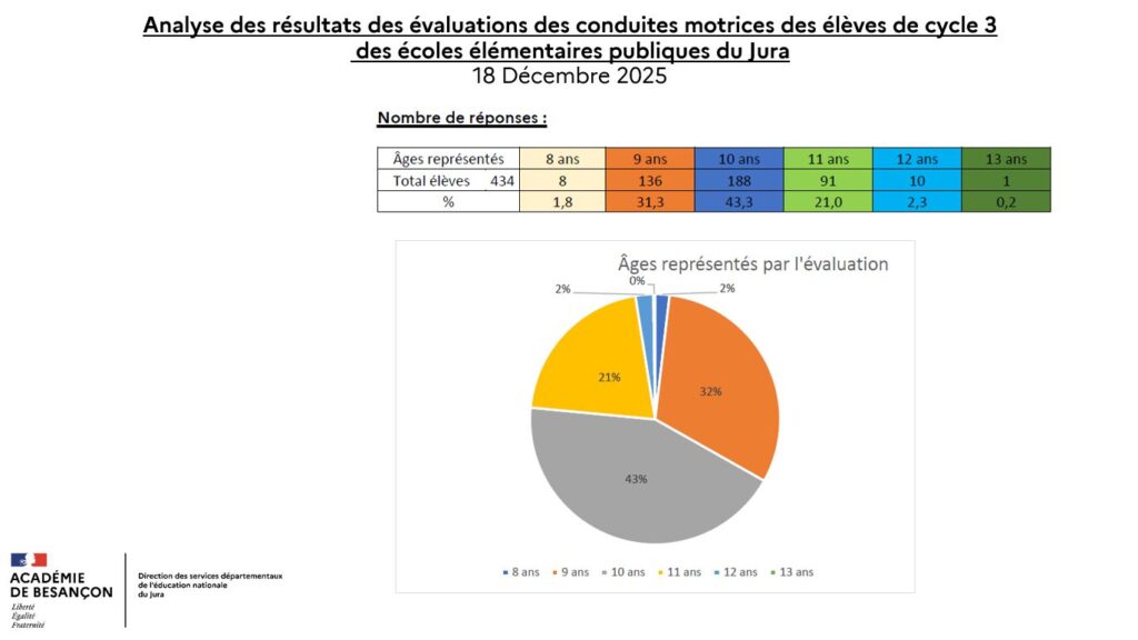 La remontée des données par les écoles volontaires témoigne de 434 résultats d’élèves. Les résultats des élèves de 8, 12 et 13 ans étant peu significatifs car peu nombreux (environ 4.3%), ils ne seront pas analysés spécifiquement. Compte tenu de l’âge des enfants, aucune différenciation n’est établie dans les résultats entre les filles et les garçons.